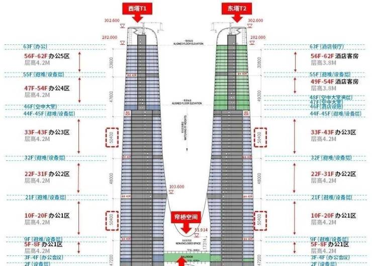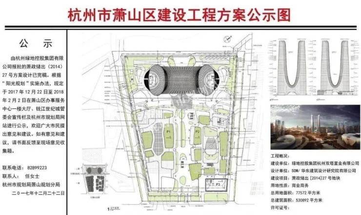 2017年12月22日,杭州市规划局在网上公示了《杭州市萧山区萧政储出(2014)27号地块方案设计》,明确了双子塔屋顶标高282米,冠顶标高302.6米(310米为黄海高程)。