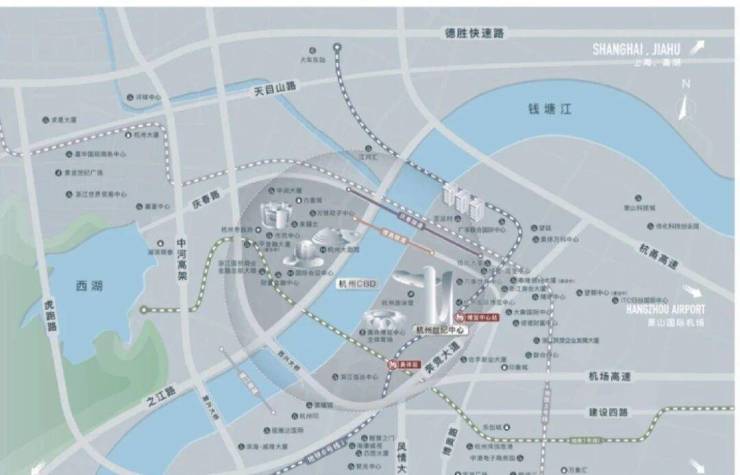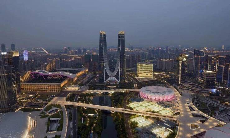 杭州之门双塔朝向远处的钱塘江和利民河,与周边的市民中心、莲花碗、杭州国际博览中心、日月同辉等核心建筑群打造一个“七星拱月”格局。
