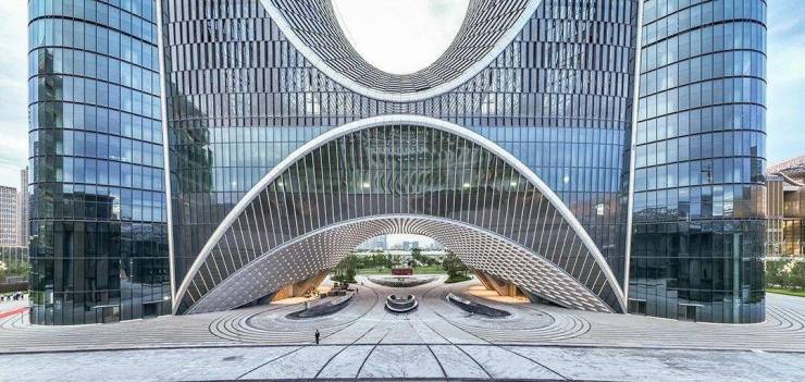 杭州世纪中心由SOM与华建集团华东院负责设计,在设计上充分考虑了杭州这座城市的特点,双塔标志性的展翅状造型源自杭州城市拼音第一个字母H,字母 “H”作为杭州之门双塔的建筑造型,也使“门”的概念得到了从抽象到具体的表达。