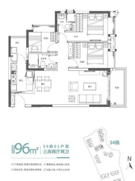 建面约96㎡滨水舒适三房:餐客厅一体化设计,连通观景阳台,卧室均规划大面宽飘窗,营造舒适生活体验。