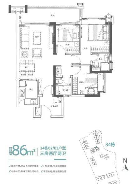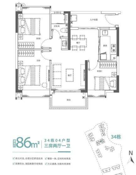 建面约86㎡南北通透三房:经典竖厅布局,南北对流,空间视野开阔,客厅直通南向阳台,引更多清风阳光入室。
