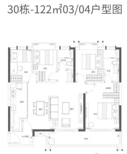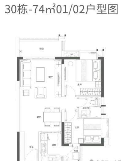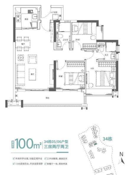 建面约100㎡瞰景大三房:约7.3米超宽阳台,迎入大量阳光,湖园美景尽收眼底,南向主卧尊享独立明卫及超大观景飘窗。
