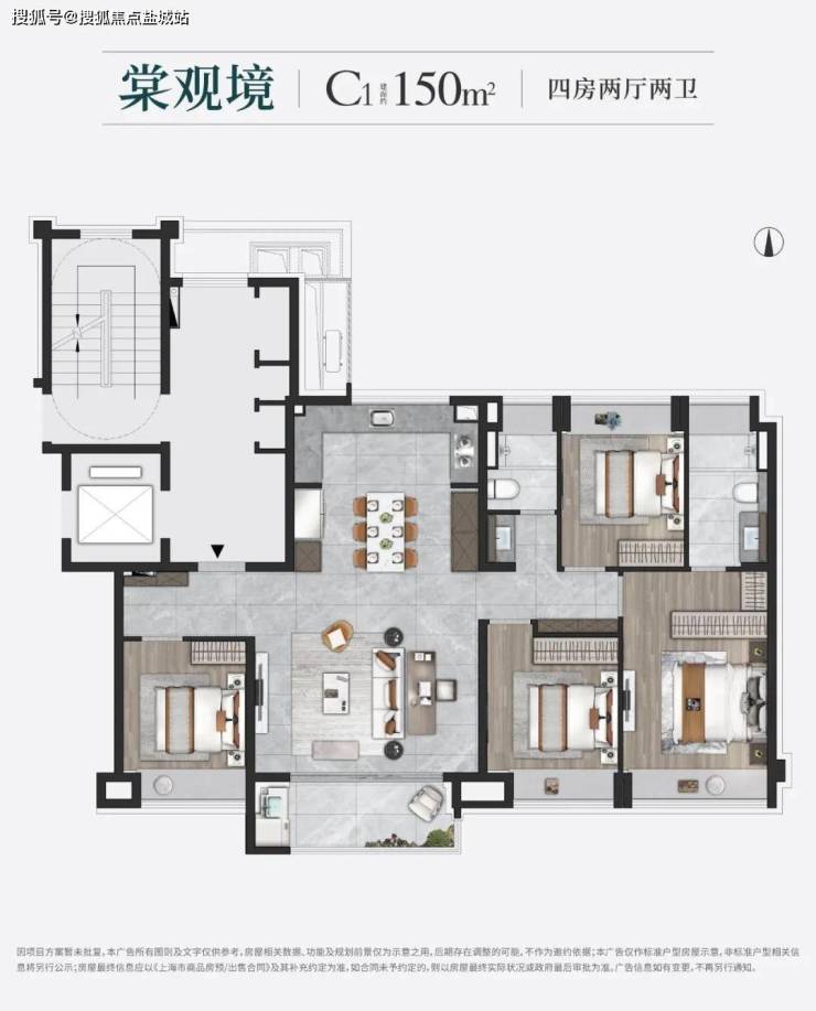 约150㎡4房2卫户型类一梯一户的居住体验,业主能独享一整个电梯厅,加上入户玄关的配置,私密性相当高。