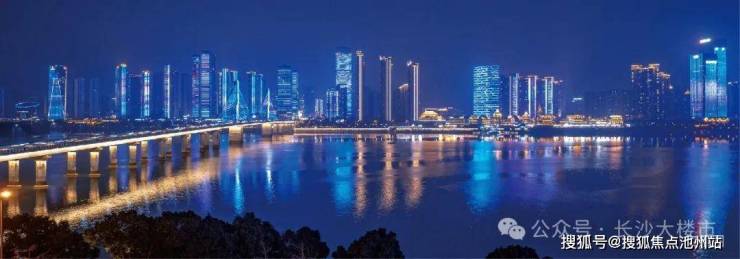 橘子洲、岳麓山、主城城景尽收眼底,视野正中央,则是滨江金融中心流光溢彩的天际线。