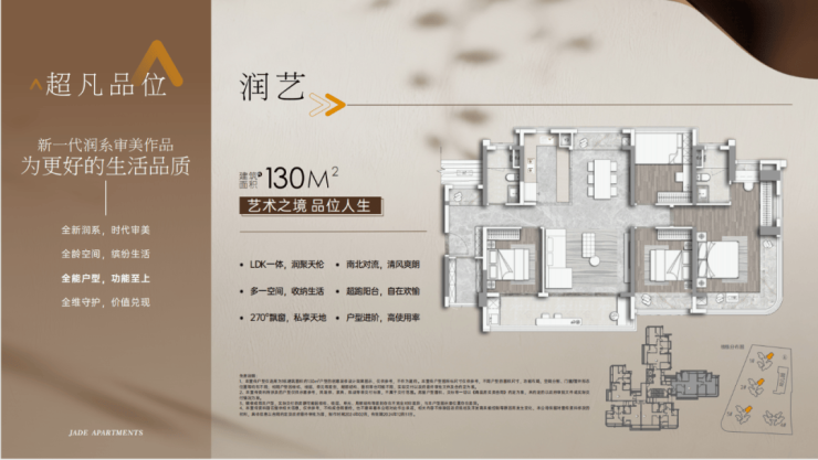 建面130平四房两卫,入户即见对景式玄关,可做景观装饰,也可做玄关柜收纳,该户型LDKB一体化设计,客厅开间超4米,可打通客厅旁的次卧做成7.2米大方厅,主卧配270度全景舱,可双面屏观景。