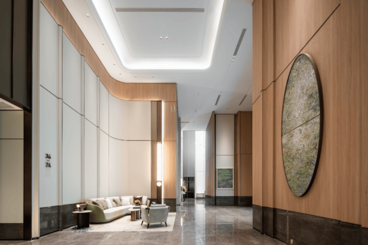 在这里,你既能看到远超业内常规尺度的约13米挑高,也能看到来自于杭州金色竹林意象的木色基调“暖装修”。其与建筑外立面形成呼应,充满盎然向上的生命力和温润质感,点缀以“玉琮青”大理石,既显矜贵又不失人文关怀。在这里,大堂将真正成为回家的过渡,成为生活的一部分。