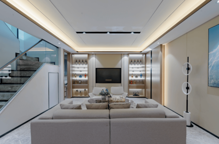 约1.2容积率低密墅区之上,高达94.7%的得房率犹如“王者归来”。主卧房全部采用套房式设计。与以往的传统联排“窄面宽长进深”的做法不同,合院的房屋设计倾向于L型建筑。玖墅新宋合院最高达9.5米大面宽的客厅,特更为凸显合院产品的横厅宽度,极富开创舒适生活的排场。