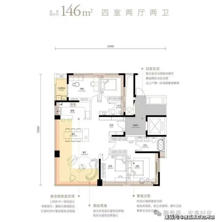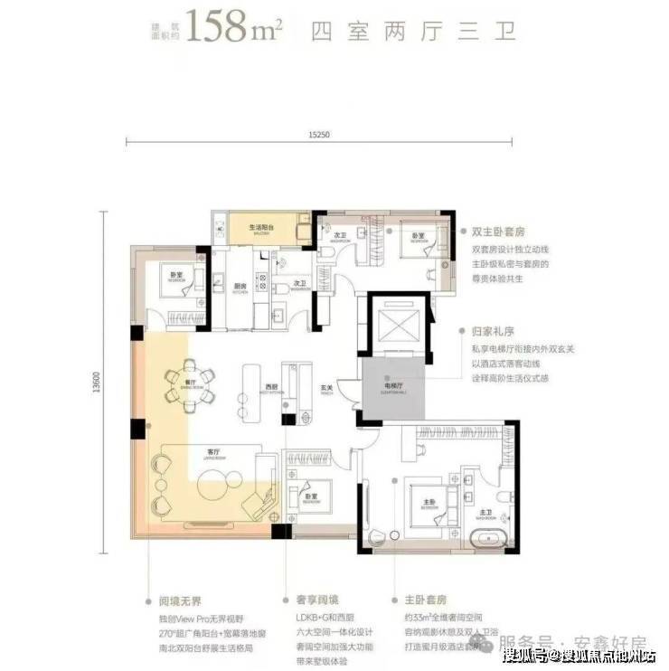 项目容积率仅2.5,为准四代产品,外立面采用大面宽玻璃幕墙与质感铝板,户户独梯入户;并配置了目前室内罕见的阳台外花池,270度天幕观景,得房率高达106%。