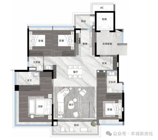 :140-252㎡板式小高层,全南向布局,正南北排布,楼间距最宽达60米。户型设计亮点包括: