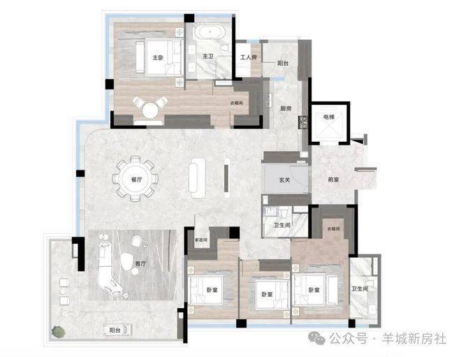 :全套房/双行政主套,15米270°转角阳台或360°巨幕景观,定制化社交巨厅达122㎡。