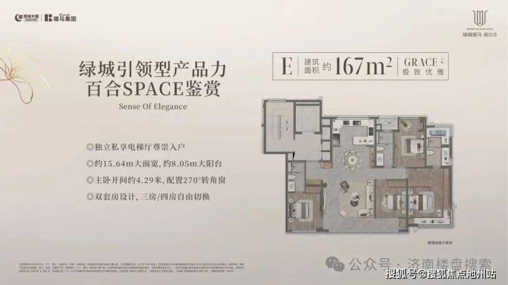 167㎡三/四室:私享电梯厅;约15.4米面宽,约8.05米阳台;主卧开间约4.29米,270度拐角窗;双套房。