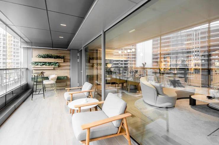 大部分户型都有270°极致观景台,同时配备了广州首例电动外遮阳系统,拉下窗帘之后依旧可以看到外面的风景。