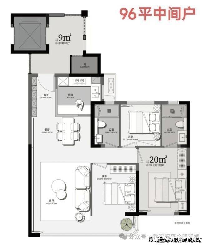出电梯有一块约9平米的电梯前室,后期可利用;客厅开间约4.1米,阳台开间约7米,并且还带270度转角视野,因是毛坯交付,后期也可以自己改造成为7米开间的大横厅;主卧面积近20平,在90多平户型里是比较难得的。这个户型实得面积(含优化)可对标市面上普通120-130平的户型。