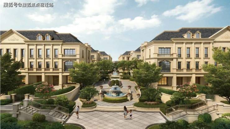 整个园区,以经典的绿城法式墅区景观大中轴贯穿,占地约1000多㎡,联排建筑的设计,融合了中国传统院落布局与法国枫丹白露宫的审美,外立面大面积采用全石材干挂,檐口等细节部位使用仿石。