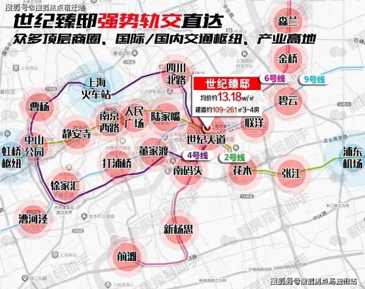 轨道交通方面:步行15分钟生活圈内,涵盖四轨交,距离2/4/6/9号线世纪大道站直线距离约400米,可直达市内众多CBD、双机场、双高铁站、国际金融贸易区、国家级产业高地等等……这样的公共交通通达度在整个上海几乎没有对手!