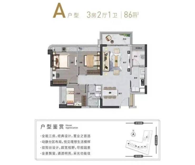 86m²户型朝向北或东北,动静分区,进门就是餐厅,厨房为L型设计,小三房,适合刚需首次置业,但由于面积比较紧凑,所以主卧不带卫生间。