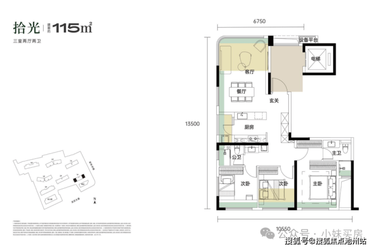 115平户型做成了端头边户,这个还是比较少见的,客厅放在了北面,并且设置成了270°全景舱户型,这样就能直接俯瞰小区内部园林;卧室全部设置在南面,保证了充足的光照。