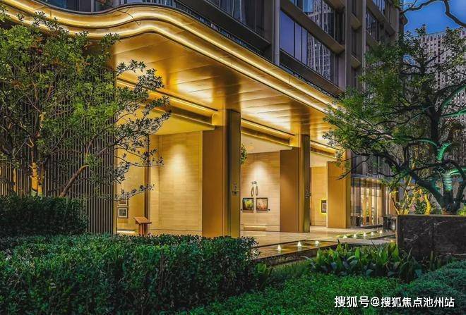 外立面采取香槟金色金属铝板+全落地圆弧玻璃幕墙,基座、中段、塔冠构成奢华感十足的外立面,打造无界大平层空间。