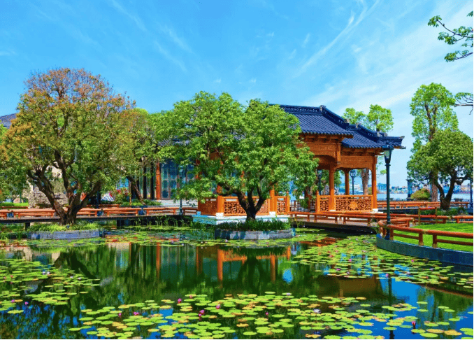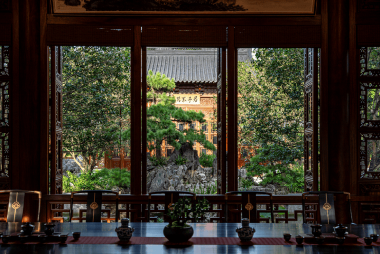 融合晋派大气与徽派精巧,千米风雨连廊串联 21 座亭台廊轩,600 余棵百年名树全冠移植,96 块匾额楹联取材唐诗宋词。