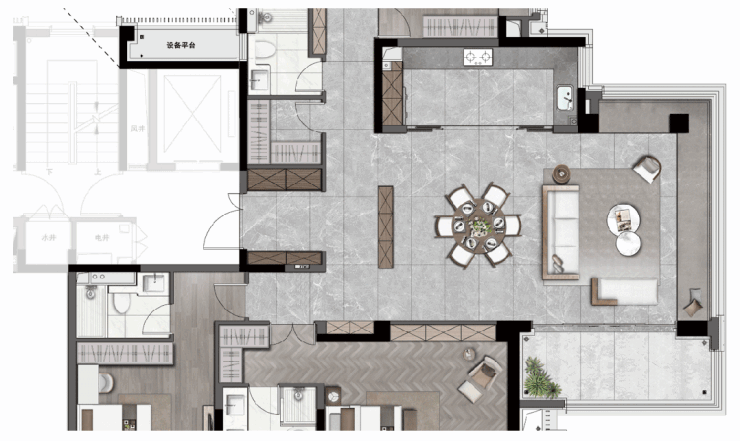 建发·玺云通过深刻考量塔尖客群的人居感受与起居生活场景,将别墅平层化,功能区都放在一个平面上,在一层内解决了家庭生活的所有功能,打造多元复合的场域精神。
