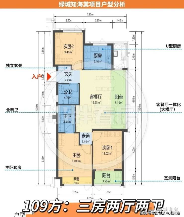 109方户型:三房两厅两卫,独立玄关,横厅边套,生活阳台+休闲阳台(全包),近13米采光
