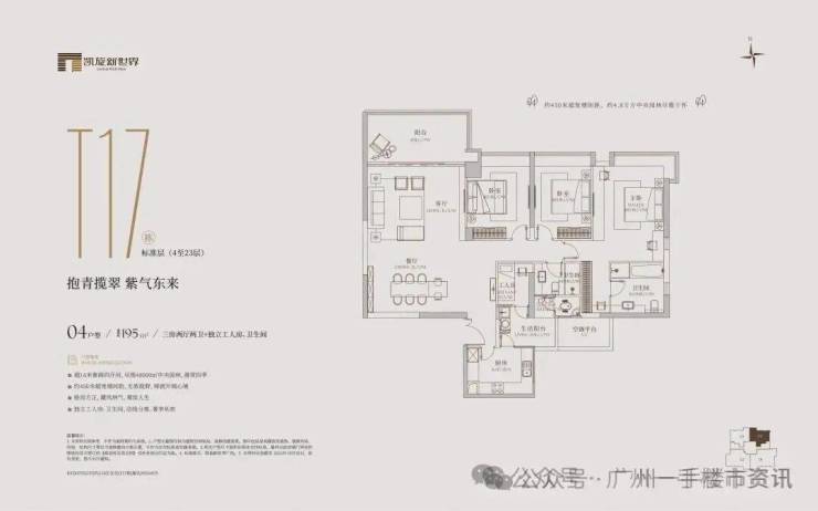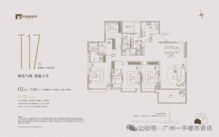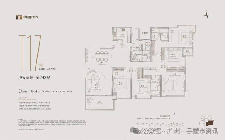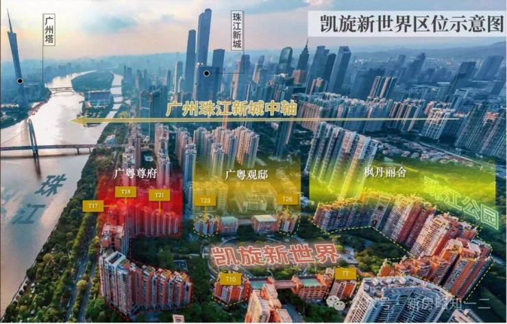 凯旋新世界三期广粤尊府将推出少量T17、T18、T21等楼栋住宅,三期T17和T18栋是广粤尊府楼王级别产品,大面积户型头排一览珠江无敌景观视野,如此顶豪可满足广州高净值人士的居住需求。
