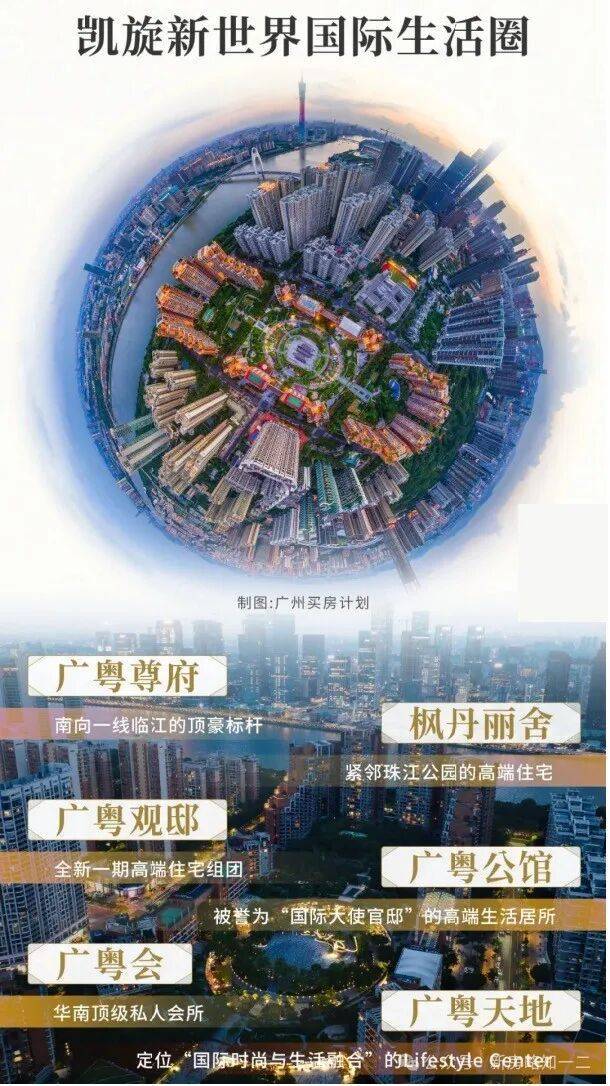 凯旋新世界呈现出的⼴粤国际⽣活圈,是⼀个都市化的国际社区⽣活中⼼,项目集高档品质住宅—「枫丹丽舍」、「广粤观邸」、「广粤尊府」,国际时尚商圈—「广粤天地」,酒店式服务公寓—「广粤公馆」,以及华南顶级社交平台—「广粤会」为一体,是珠江新城最具生活氛围的社区,吸引着多国驻广州领事以及驻穗外企高管于此居住,广粤会会籍已价值22万/个。