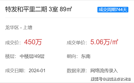 特发和平里,二期中楼层87㎡3房东南向,1月成交单价在5万/㎡左右。