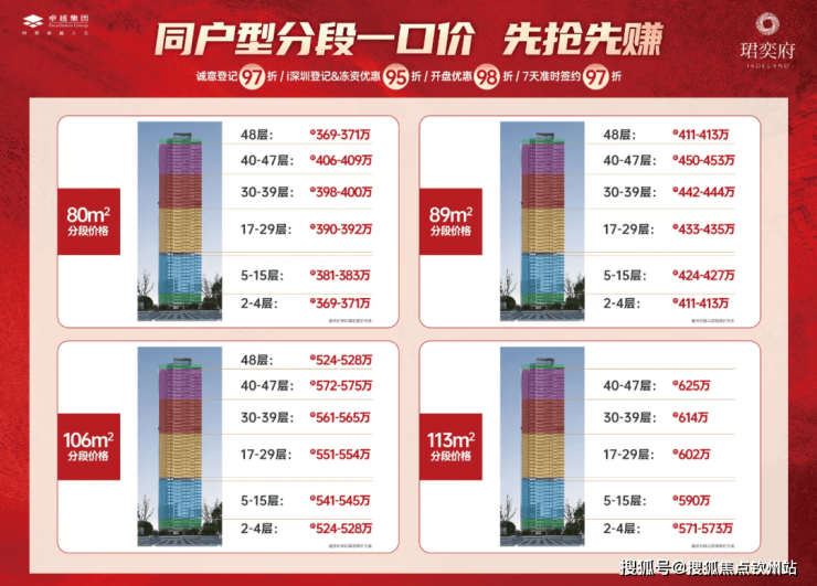 “410万内任选80㎡”、“455万内任选89㎡”,同样的预算,同样的面积,可以选到更好的楼层。