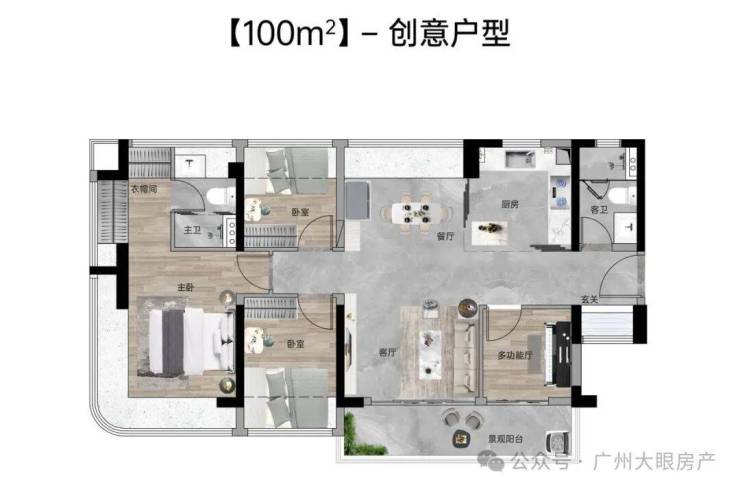 【100㎡四房两厅两卫】:西南向,使用率109%,南北通透,约6.1米巨幕阳台,主卧270°主卧弧形玻璃幕窗。