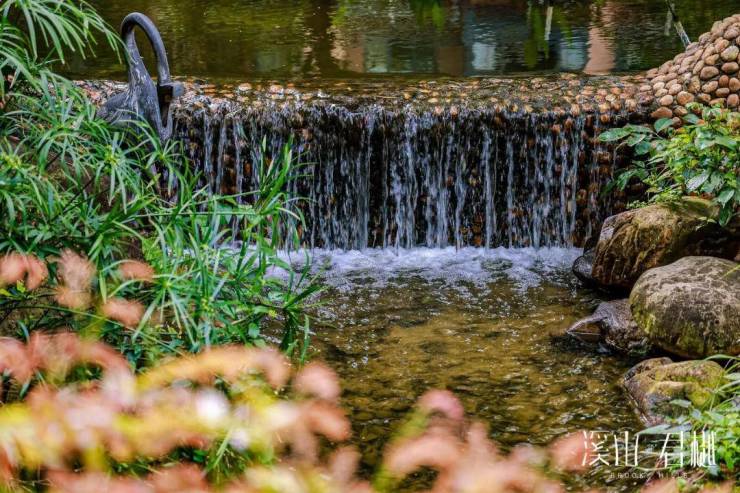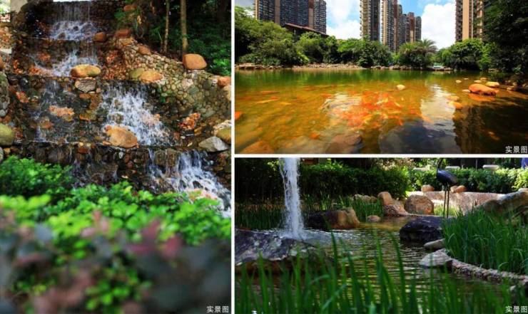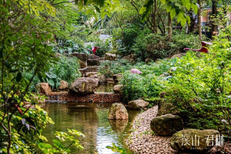 项目内部打造了一条沿着台地蜿蜒的溪流,该水系为市面罕见的活水溪流,贯穿整个社区园林,依据溪岸的曲直不同和地形变化,打造叠水、溪流、瀑布、水潭等多样特色水景,溪岸植物种类繁多,与水流互为风景,沿岸专门设置不同的亲水平台,营造自然灵动的栖心之境。