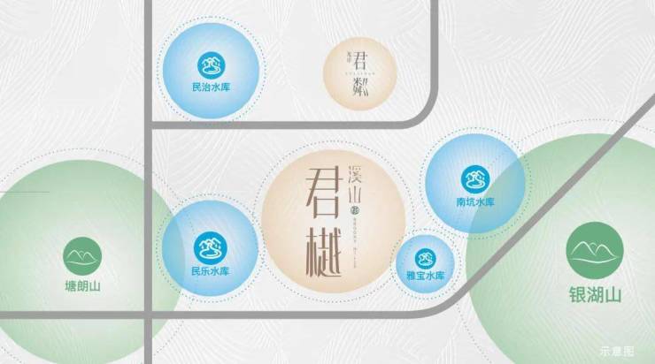 溪山君樾位处深圳“中心湖区“,是深圳最稠密的湖区所在地,项目周边环伺4大自然生态湖泊---民治水库、民乐水库、雅宝水库、南坑水库,居住在此,湖岸微澜风光无限,滋养健康涵养心境,孕育都会生活于家族贵雅之道;独享城市无价峰顶对晤湖景无垠的豁达高远。