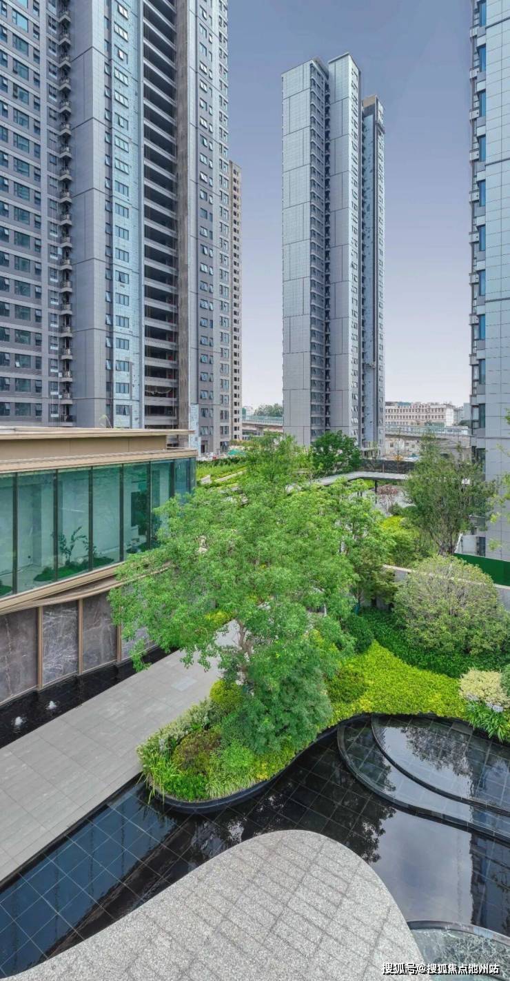 大体量社区,保证了大体量景观。我在看见保利国贸·璟上第一眼,就被景观吸引了。因为开发商做了一片长约180m、宽约50m、建面约10000㎡的超尺度景观中庭,这景观,太有气势!
