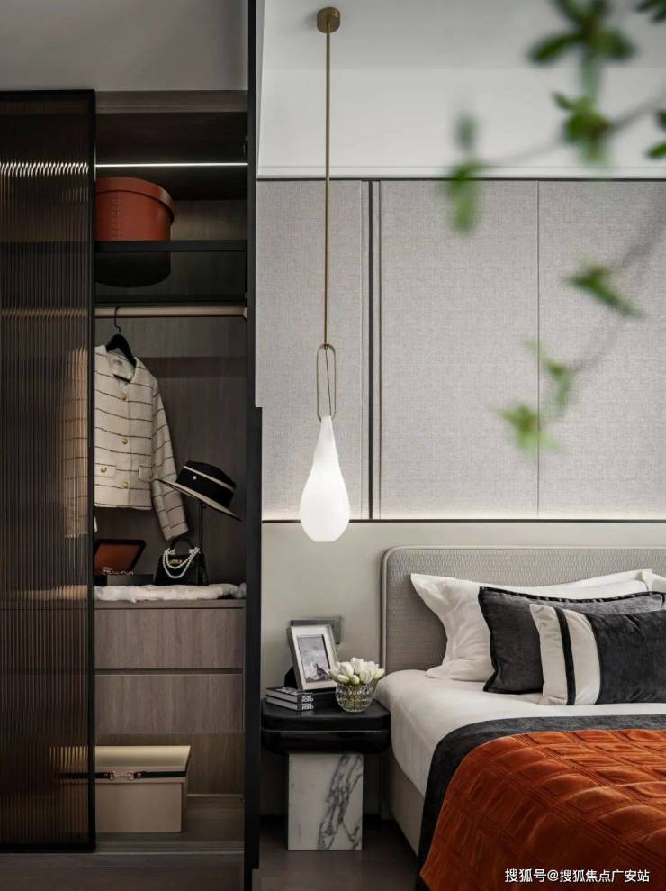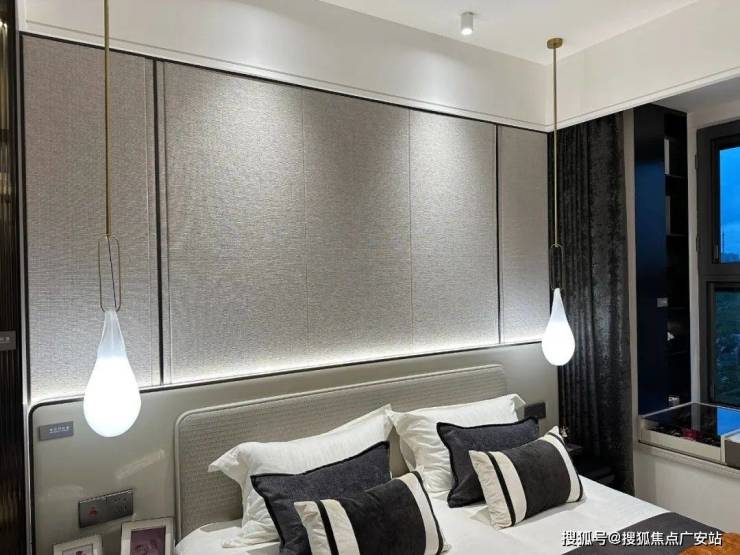 主卧床背景墙进行了软包处理,省去了业主未来二次装修的时间、精力跟成本,更好的给业主一个舒适且高颜值的家。