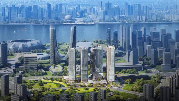 整个建筑群的布局沿着奔竞大道展开,由四栋塔楼和附属的酒店配套裙房共同组成。这个 26 万平方米的综合体项目,由七位行业大师联袂打造,其设计的核心理念是将国际化大师的智慧结晶、艺术性生活表达和杭州本土文化的融合,创新出一个独一无二的“城市会客厅”。