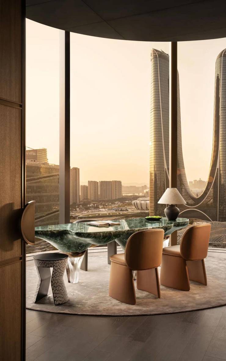 室内由 CCD(郑中设计事务所)打造,凸显了现代奢华和品味的精髓,从高档材料的运用到开放式的空间布局,270度“无柱转角落地客厅”站在Amber 98的样板间,奥体地标杭州之门近在咫尺,仿佛每一个建筑细节都触手可及。全屋通高的柜体,头顶的无边框灯具,将本就优越的层高直接拔高到了“奢享”的概念。