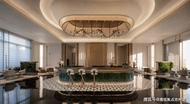 可以看到,这个项目的整体审美风格,是以鎏金溢彩为主色调,通过考究的金属、石材、玻璃、特殊涂料材质搭配与精妙的光影设计,赋予场域充分的奢华格调。