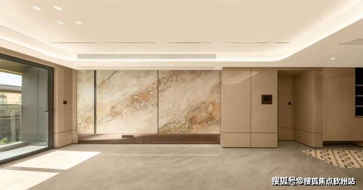 入户门采用400斤定制铸铝门,大户的尊崇感扑面而来;玄关柜采用贝母漆装饰面板+云石亚克力。
