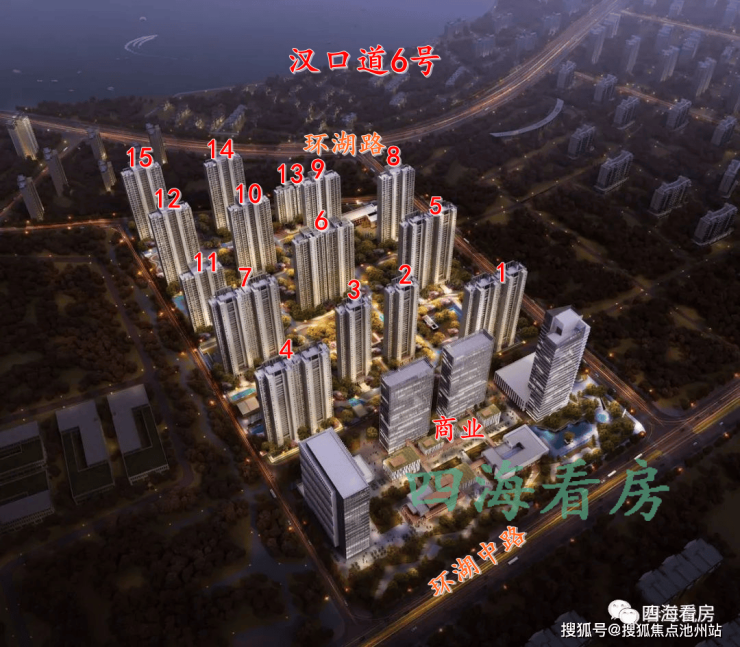 汉口道6号总建面约41.7万方,其中住宅建面约29.6万方,商业、商务建面约11.2万方,容积率3.38,共2424户,机动车停车位5131个,车位比1:1.5,包含15栋住宅、1所幼儿园及商业、商务办公楼。