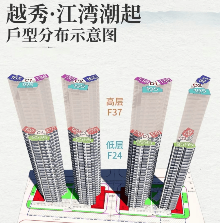 高区为25-37层,两梯三户,有建面约135、160、195平三种户型。