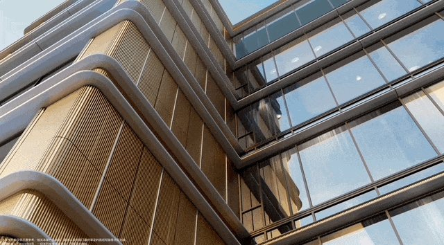 陶板的表面上,多了一层高温煅烧成金色釉面的材质,能够防污且不易褪色和变形。除陶板这一立面界的“爱马仕”,项目还创新采用了苹果旗舰店“无立柱玻璃幕墙”的全新工艺,打造“冰川瀑布屏”270°环幕,宁波超高层地标和东部新城核心商圈尽收眼底。
