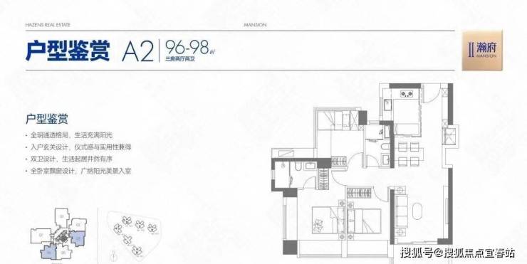 96-98㎡的3房2厅2卫,A2户型/2栋2单元03/06,设计的是经典竖厅格局,客厅3.5米开间,LDKB一体化,S墙设计预留冰箱卡槽位,动静分区,三开间朝南,主卧+1个次卧双飘窗,得房率约78%(不含赠送),U型厨房,卫生间干湿分离,西南或东南朝向。