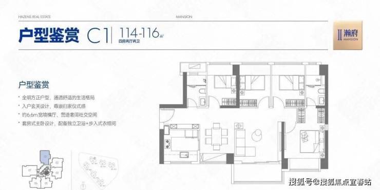 114㎡的4房2厅2卫,C1户型,设计的是横厅南北通透格局,客餐厅6.6米开间,LDKB一体化设计,四开间朝南,全屋7面飘窗,主卧套房+步入式衣帽间,3个次卧朝西北向,得房率约78%(不含赠送),U型厨房,卫生间干湿分离,东南朝向。