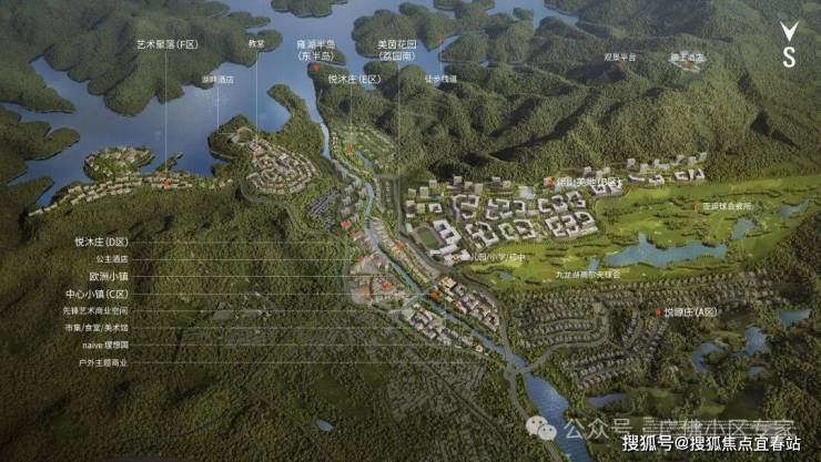项目重点建设中心小镇C区、艺术聚落F区、伴山美地B区三大园区,并串联现状山地游乐、国王酒店、欧洲小镇与集散中心。
