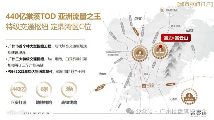 卖点三、城市枢纽, 畅达全球: 横跨双地铁, 东邻白云大道, 西至广云路, 北接华南快速, 南接内环路、广园 快速, 15 分钟达越秀老城区、20 分钟即达珠江新城。投资 440 亿广州白云站距离项目 3.5 公里, 中 国在建最大火车站、广州三大特级交通枢纽之一、亚洲流量之王。