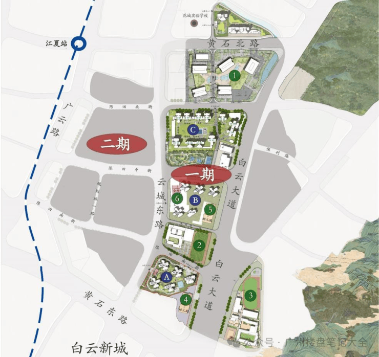 卖点四、千亿配套,豪宅大城: 项目约 200万㎡, 涵盖 10 大住宅组团+5 大商业组团+2 大教育组团+1 山景 中央会所+1 社区花园, 自成一城, 浓缩最顶尖的生活圈。5-10 分钟内即享白云国际会议中心、广州 体育馆、广东画院、广州市儿童公园、广东外语外贸大学、广外附小、广东省实验中学、培英中学、 广东省人民医院、南方医科大学南方医院,最优质省市级资源环绕。