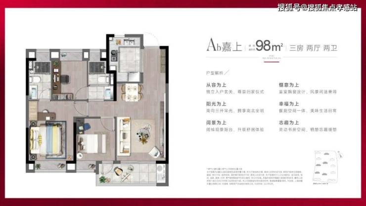 该户型在88㎡户型的基础上,将尺度进行了升级,双卫设计,三开间朝南+动静分离,室内采光面非常大,通透明亮。