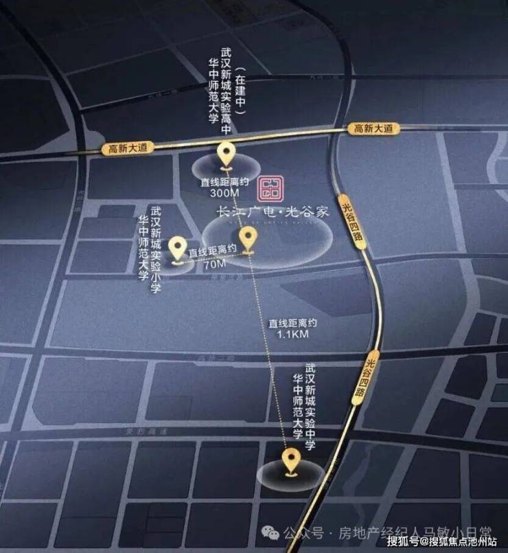 西边是小学、南面是初中、北面就是高中,长江广电光谷家简直是被华师系小学、初中、高中包围,且距离非常近!