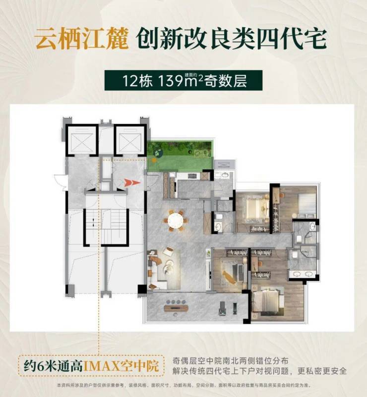 传统四代宅的上下对视,让露天空间成为心理负担。云栖江麓通过南北错层设计,将空中院设置在户内,让每家每户的庭院都成为真正的私密领地。父亲的晨练、母亲的茶叙、孩子的嬉戏,都不再是别人眼中的“风景”。这份自在,才是改善生活的真谛。