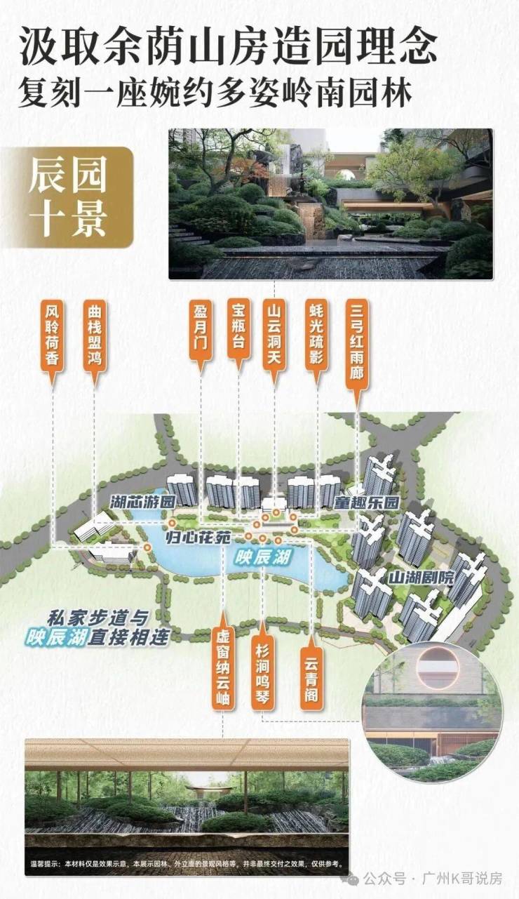 项目汲取余荫山房造园理念,采用“缩龙成寸”的设计理念,以水居中,环水建园,打造了「辰园十景」。